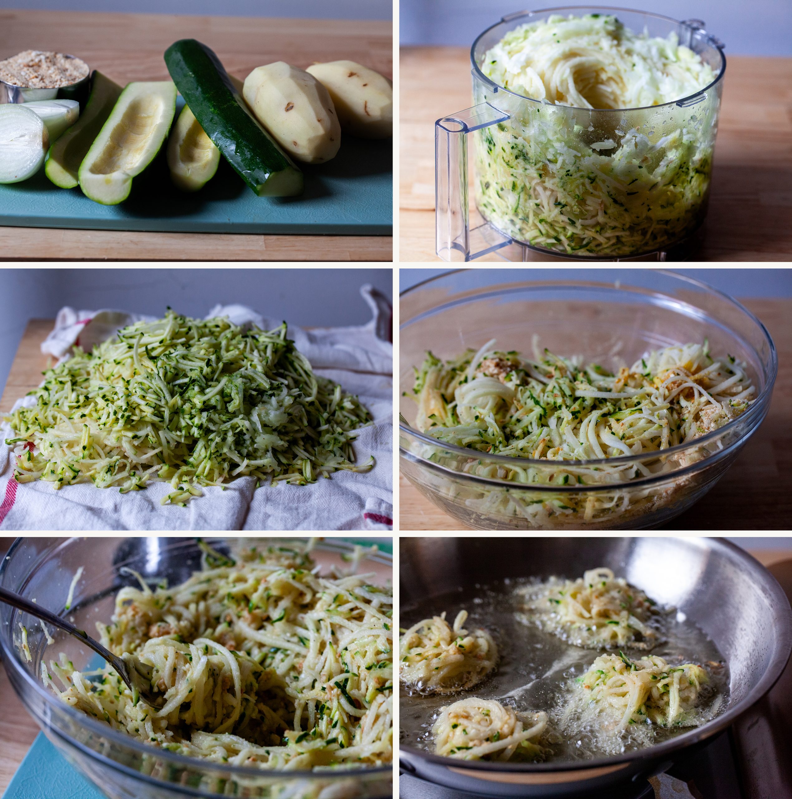 Prepare the batter: Trim the ends of the zucchini and halve it lengthwise, then use a small spoon to scoop out and discard the seedy centers, which will add more moisture than we want. In a food processor or on the large holes of a box grater, grate the zucchini, potato, and onion. Gather the grated ingredients in a large lint-free kitchen towel and twist it, wringing out as much moisture as you can. Let rest for 2 minutes, then squeeze again. Transfer wrung-out mixture to a large bowl and add matzo meal, egg, lemon juice, salt, and pepper and stir until evenly mixed.